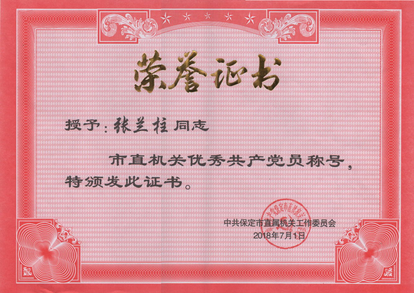 黨委書記張?zhí)m柱榮獲2017年度市直機關優(yōu)秀共產黨員榮譽稱號